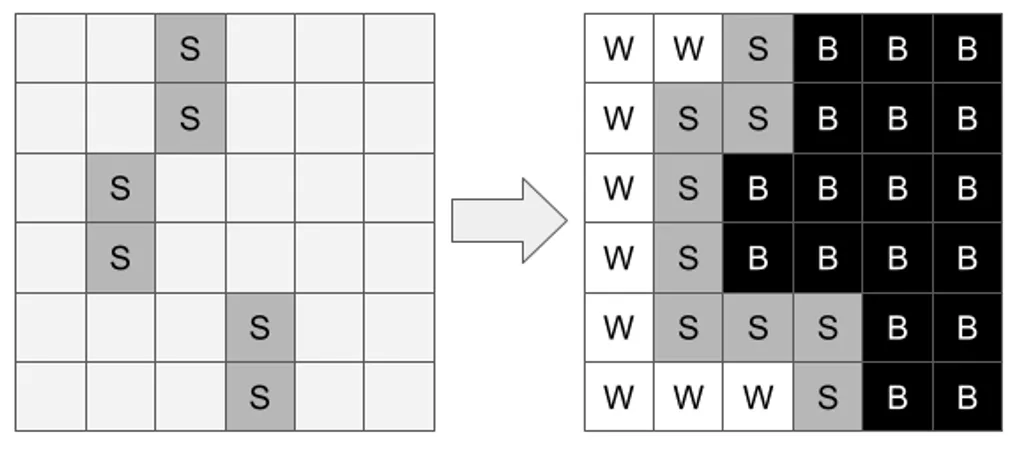 즉, 격자 안의 칸은 각각 왼쪽 구역, 오른쪽 구역, 분리자 중 하나에 소속된다. 편의상 각 칸을 W, B, S로 표시한다.